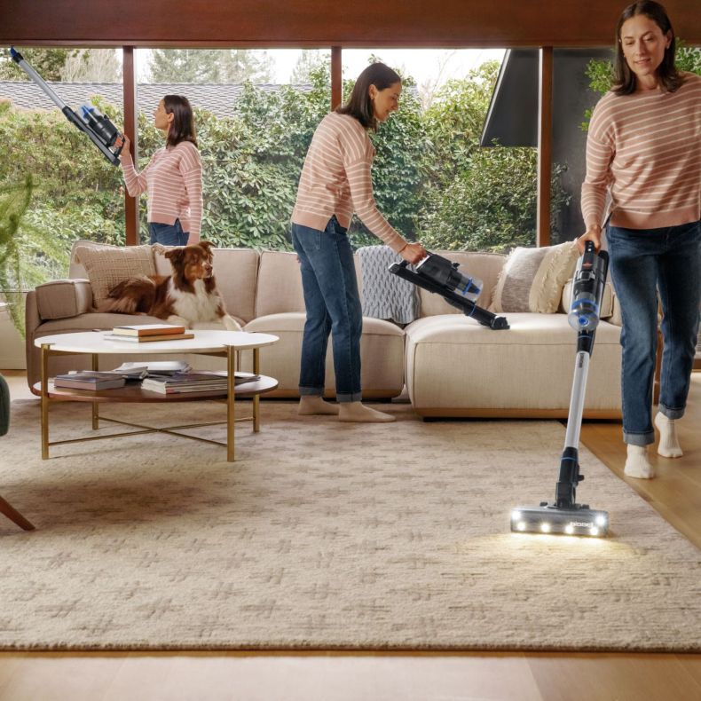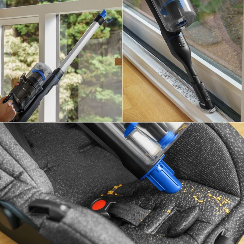 Cambia sin esfuerzo de la escoba aspiradora al aspirador de alto alcance y al aspirador de mano para una limpieza de suelo a techo.