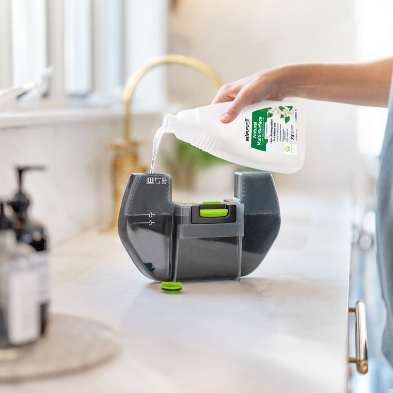 Cuando termines de limpiar, el mantenimiento es fácil: únicamente tienes que vaciar el depósito sucio de solo seco y echar las gamuzas lavables de la mopa a la lavadora.