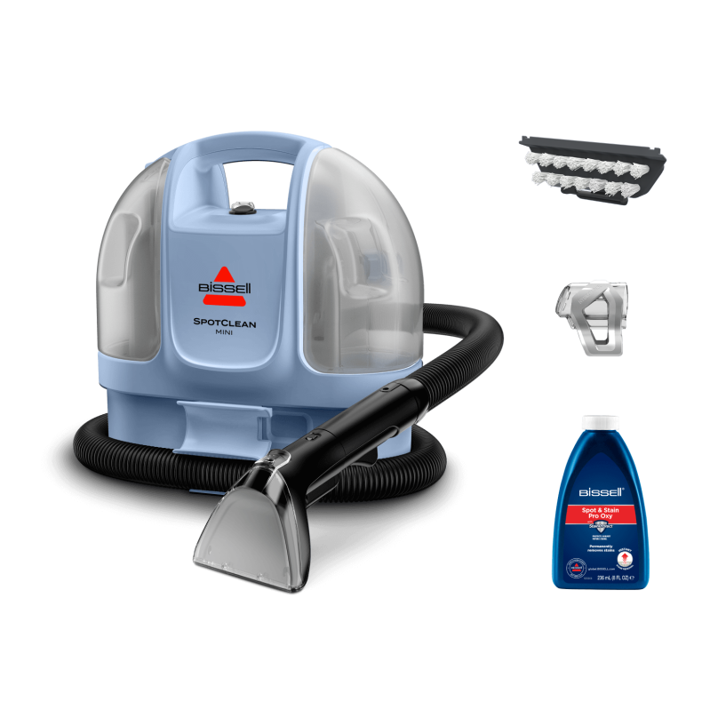 Ahorra espacio sin perder capacidad de limpieza. Usa el limpiador portátil para moquetas y tapicería BISSELL® SpotClean® Mini para pulverizar, frotar y eliminar las suciedadeas más difíciles en cualquier superficie. SpotClean® Mini es nuestro dispositivo portátil de limpieza profunda más ligero y compacto hasta la fecha y te permite acceder fácilmente a superficies difíciles de limpiar, como escaleras o interiores de vehículos.